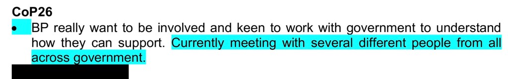 - During a 2-week period in March, BP discussed its involvement in COP26 at four separate meetings across government, including over lunch with Minister for Business Kwasi Kwarteng, where notes recorded how: