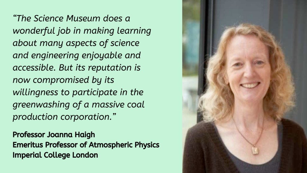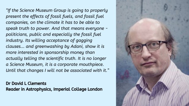 “The Science Museum has been dismissing all critics of its fossil fuel partnerships as wilfully misinformed activists but, in reality, it is facing a profound crisis in confidence from the scientific community and losing the public’s trust. In the wake of COP26, there is no justification for providing positive PR to companies heavily involved in fossil fuel extraction but the Science Museum’s leadership remains determined to side with Shell and Adani against scientists, their own contributors, young audiences and even some of their trustees. It’s time they admitted their mistake and engaged with those who care so deeply about the museum’s future that they are willing to pass up paid work and prestigious opportunities to make their concerns heard.”
