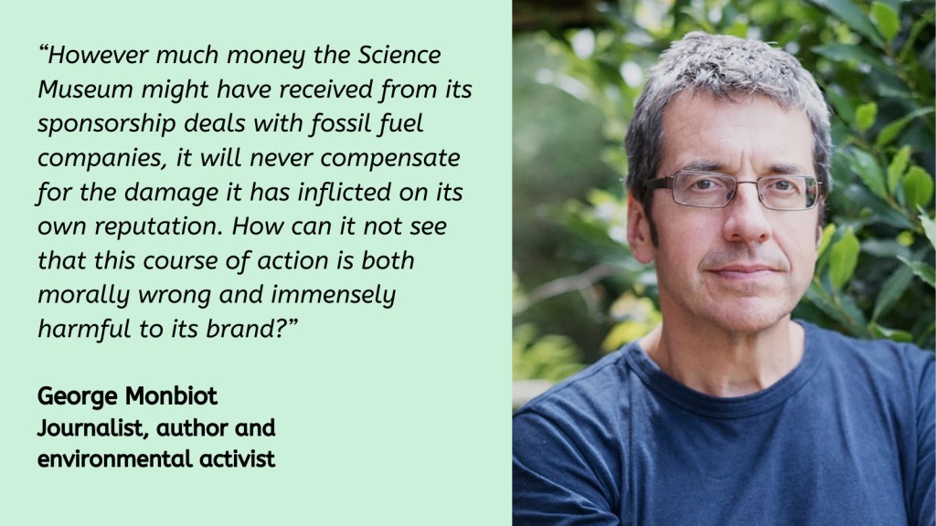 - George Monbiot – journalist, author and environmental activist who pulled out of one of the museum’s ‘Climate Talks’ earlier this year on discovering they still had partnerships with fossil fuel companies