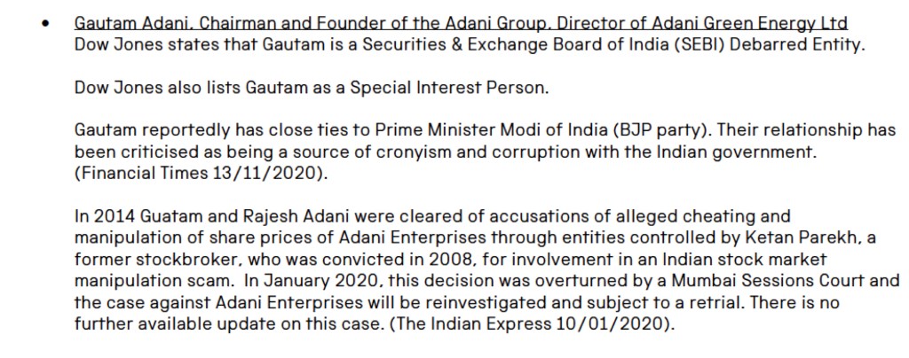 - The museum’s due diligence report on Adani Green Energy fails to include the word ‘coal’ at all, despite including a summary of the Adani Group’s wider business activity, undermining the point of a due diligence process which is to identify likely controversies around a particular company. However, it does identify corruption allegations against the chairman and that he’s been debarred from trading on the Indian stock exchange.