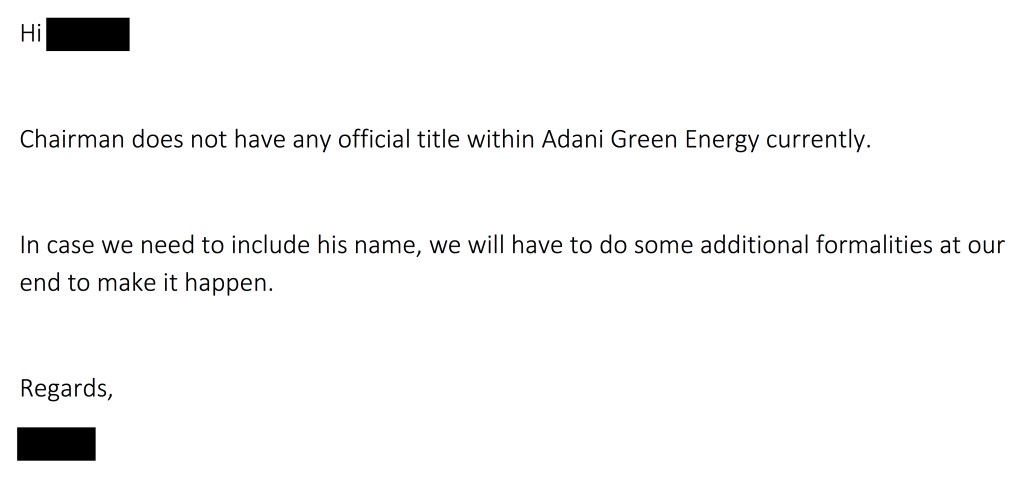 There is even some confusion around the signing ceremony as to whether Adani Group Chairman Gautam Adani can legally sign the contract as he doesn’t have an official title in the subsidiary. (‘Chairman does not have any official title within Adani Green Energy currently. In case we need to include his name, we will have to do some additional formalities at our end to make it happen.’) but then there is a clarification that actually he’s the Chairman of Adani Green Energy too.