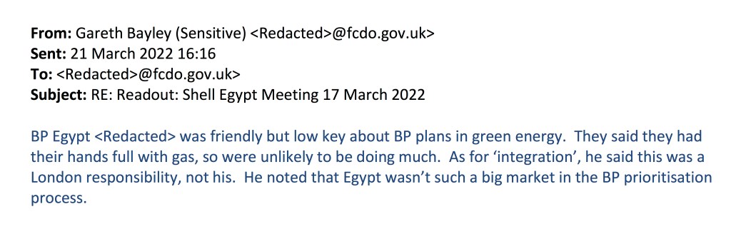 - Documents released by UK Foreign Office under FOI shine spotlight on BP’s major focus on fossil gas in Egypt