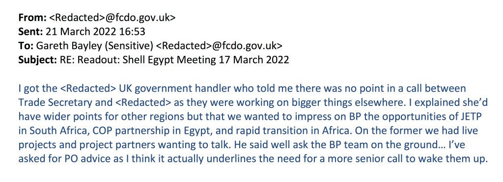 ‘We wanted to impress on BP the opportunities of [the Just Energy Transition Partnership] in South Africa, COP partnership in Egypt, and rapid transition in Africa.’