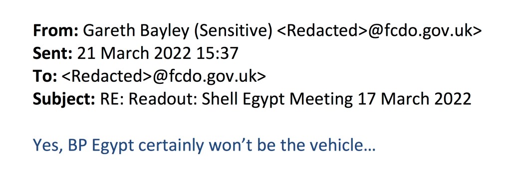 - In an email sent on 21st March 2022, British Ambassador to Egypt Gareth Bayley writes to a colleague following a meeting:
