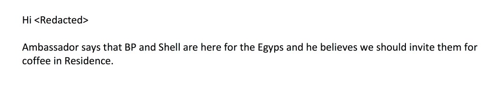 - The emails also give an illuminating insight into informal networking that plays out between BP, the British Embassy and the Egyptian government, at occasions like Polo matches. In October 2021 the Ambassador and an unnamed official: