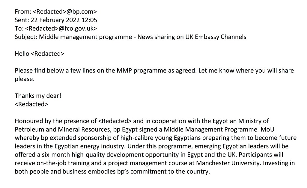 - An email from BP sent on 22nd February 2022 shows BP also asking the British Embassy to help promote its close partnership with the Egyptian government on its media channels, specifically its continued collaboration with Egypt’s Ministry of Petroleum and Mineral Resources on a ‘Middle Management Programme’ involving work-based training and a course at Manchester University in the UK: