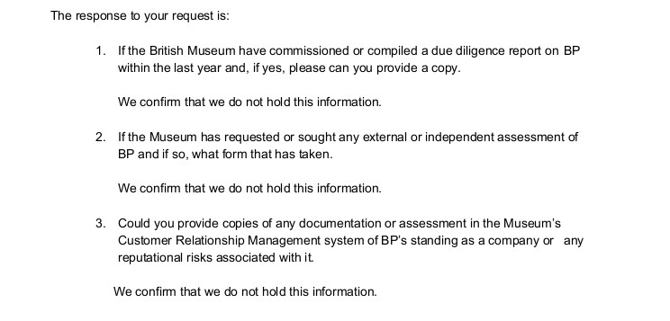 But, in response to a recent FOI request, the Museum refuses to even ‘confirm or deny’ whether it holds information related to BP potentially paying money into this initiative.