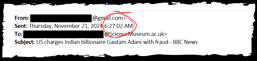 The Museum’s Executive were not forewarned by Adani, catching them totally off guard when the indictment news was first published in the media on 20 November 2024. The disclosures show Trustees and executives demanding clarity, citing pressure from activists, and calling for meetings, with emails sent into Director Ian Blatchford’s inbox at 6.30am the following morning and an MS Teams call put in for 7.30am.