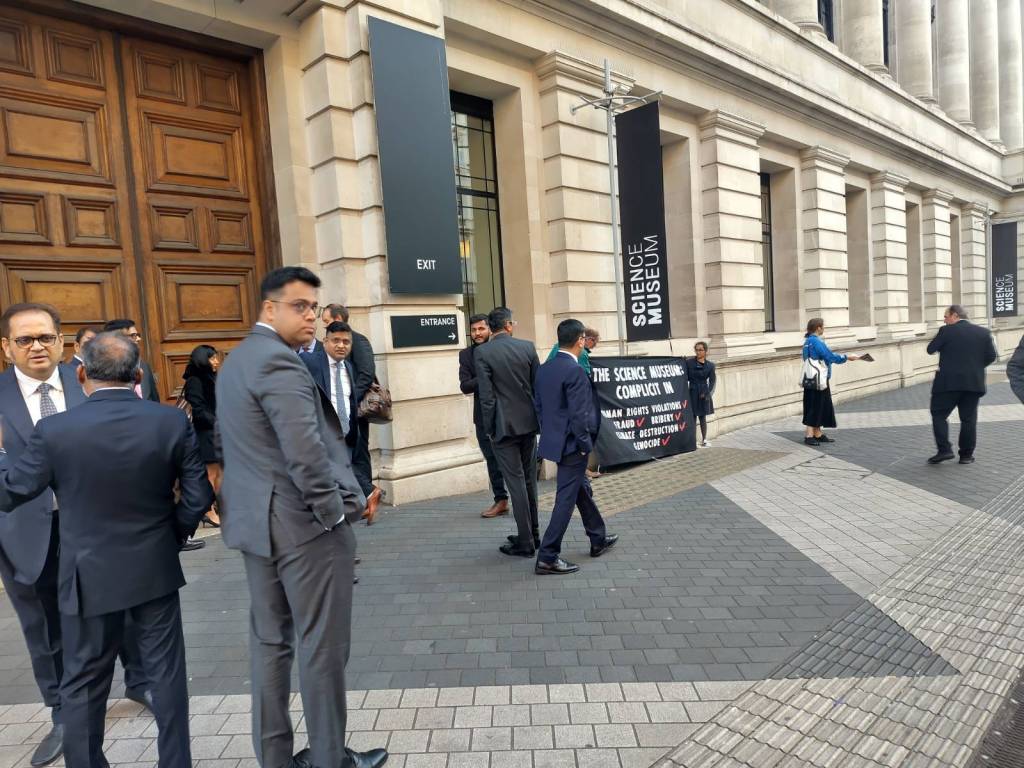 Adani, the world’s biggest private producer of coal, held its private reception for investors inside the Science Museum’s ‘Energy Revolution: Adani Green Energy Gallery’ which opened last year amidst large-scale protest. As around 50-60 smartly dressed guests arrived, they were greeted by activists who unfurled a banner at the museum doorway which read, “The Science Museum: complicit in human rights buses, fraud, bribery, climate destruction, genocide.”