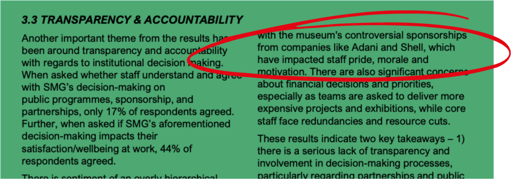 - Widespread “ethical concerns with the organisation’s controversial sponsorships which impact staff pride, morale and motivation” across the Science Museum Group (SMG)
