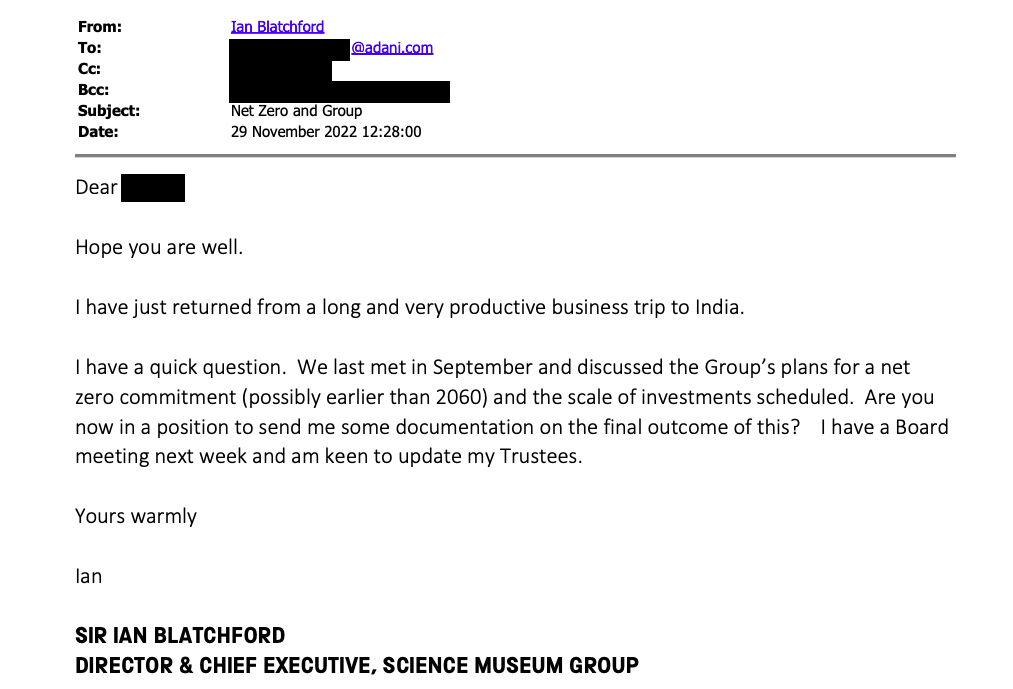 Director Ian Blatchford pursued a partnership with the Adani Group, despite its controversial coal projects, pushing the sponsorship of a new climate gallery as a “global profiling opportunity” and the chance to “showcase its leadership in the energy transition” (FOI disclosure, correspondence with Adani, p4).