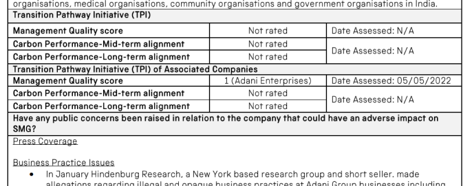 In particular, the Hindenburg Group’s allegations of corruption at Adani and the clear evidence that Adani Green Energy is ‘intricately linked’ to the Adani Group’s other operations, specifically its coal business.