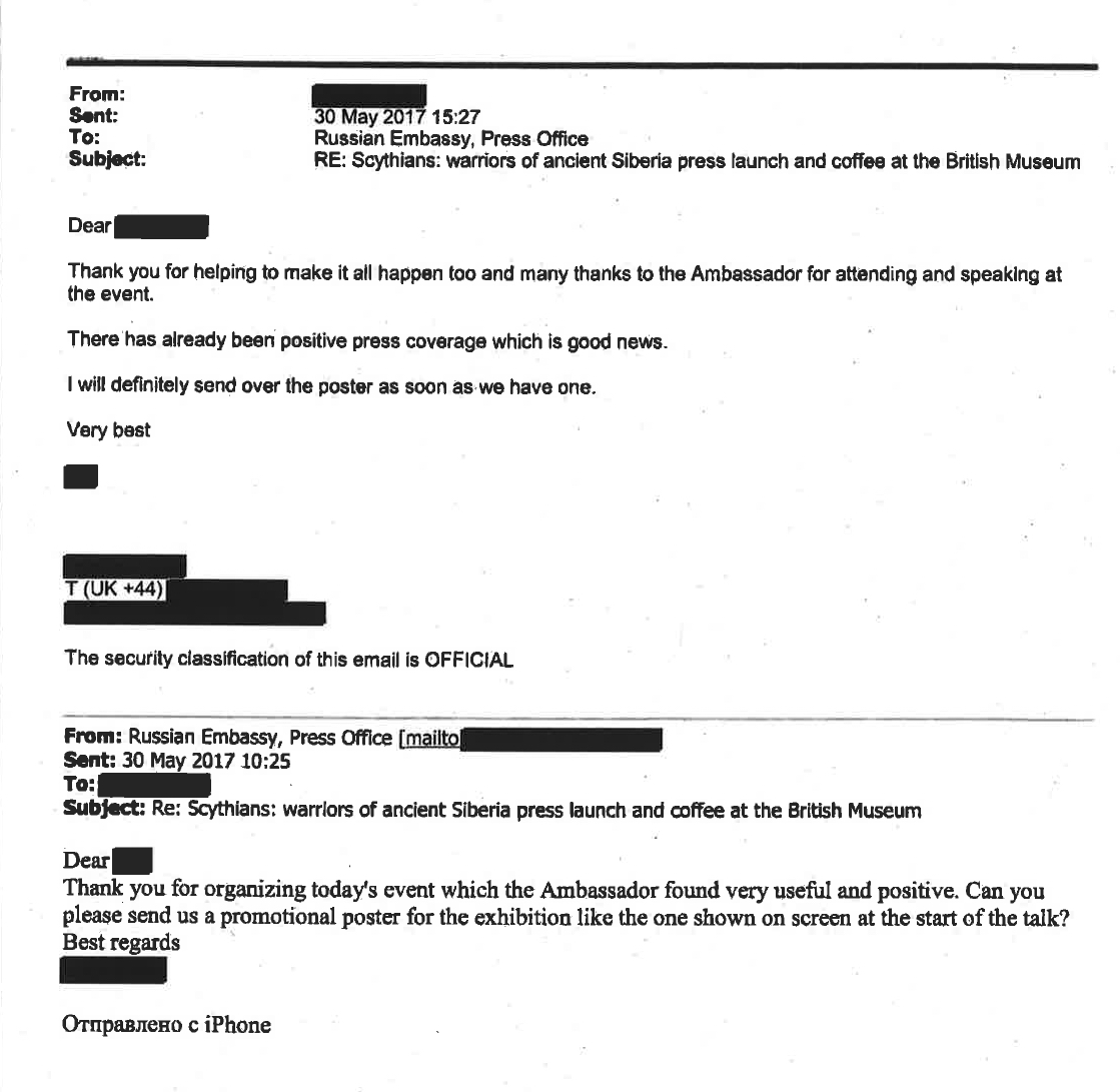 You can also view follow-up emails between the British Museum and the Russian Embassy, where the Ambassador described the event as ‘very useful and positive’, here.