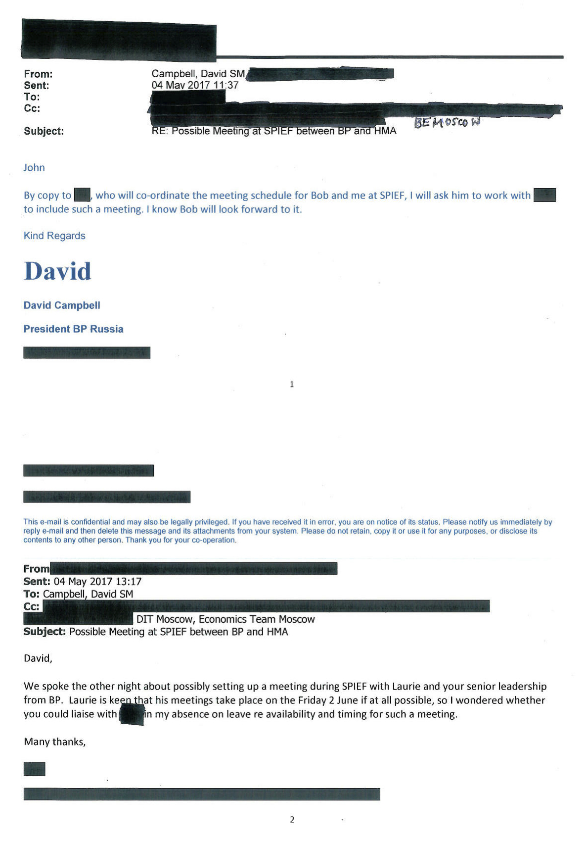 View the email to BP Russia’s President setting up the meeting here. In his reply, David Campbell says, ‘I know Bob [Dudley] will look forward to it’.