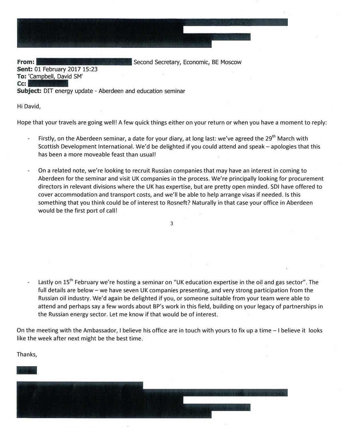 A few days before this meeting, the DIT attempted to set up an additional meeting between the BP delegation and the department’s Director of Energy Campbell Keir, to take place shortly before the meeting with Liam Fox. Campbell Keir was a Country Director for Shell for 7 years before being seconded to the UK government.