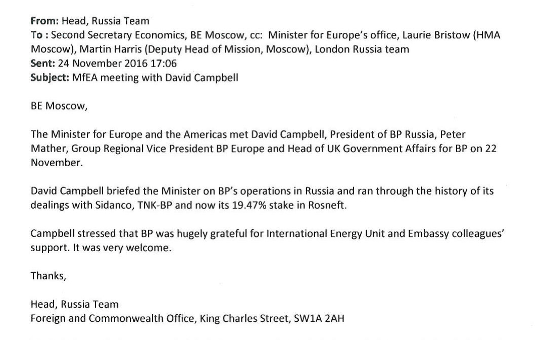 Just over a year ago, BP Vice President for Europe Peter Mather and BP Head of UK Government Affairs Andrew Manner meet with the Minister for Europe and the Americas Alan Duncan MP. Also attending that meeting, is the President of BP Russia David Campbell. In notes sent to the British Embassy by the head of the Foreign Office’s Russia team, it is clear that the Minister was given a detailed overview of BP’s history and current operations in Russia. What stands out in the email though, is the following: