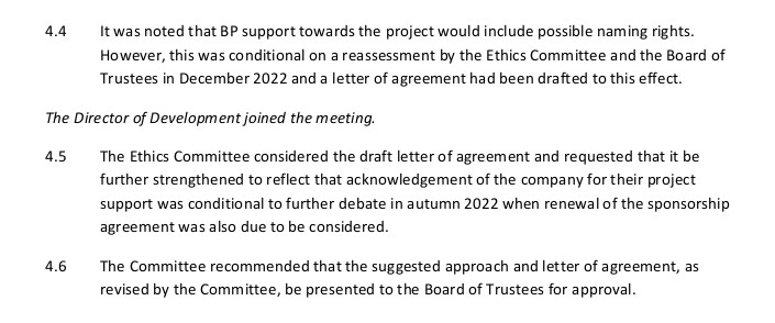 Its meeting minutes from February 2020 detail how the Committee insisted that the letter of agreement with BP with regard to BP’s possible naming rights should be “further strengthened to reflect that acknowledgement of the company for their project support was conditional to further debate in autumn 2022” and that this should also be presented to the Board of Trustees for Approval.