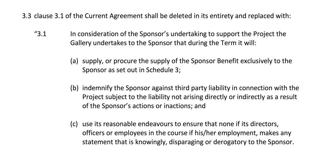 The documents that were eventually disclosed by the Gallery provided some fascinating insights into what might have played out internally at the Gallery. A signed ‘variation’ to the Gallery’s contract with BP set out a troubling “non-disparagement clause” which commits the Gallery to ensuring that none of its Directors, officers or employees will make any statement that is knowingly disparaging or derogatory to BP.