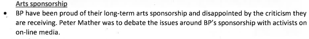 However, emails released following our FOI request have revealed that Ian Blatchford made arrangements to have an “informal chat” with BP to discuss arts sponsorship the same day he sent that original email to staff. A member of staff from BP, who is presumably Vice President Peter Mather, asks: