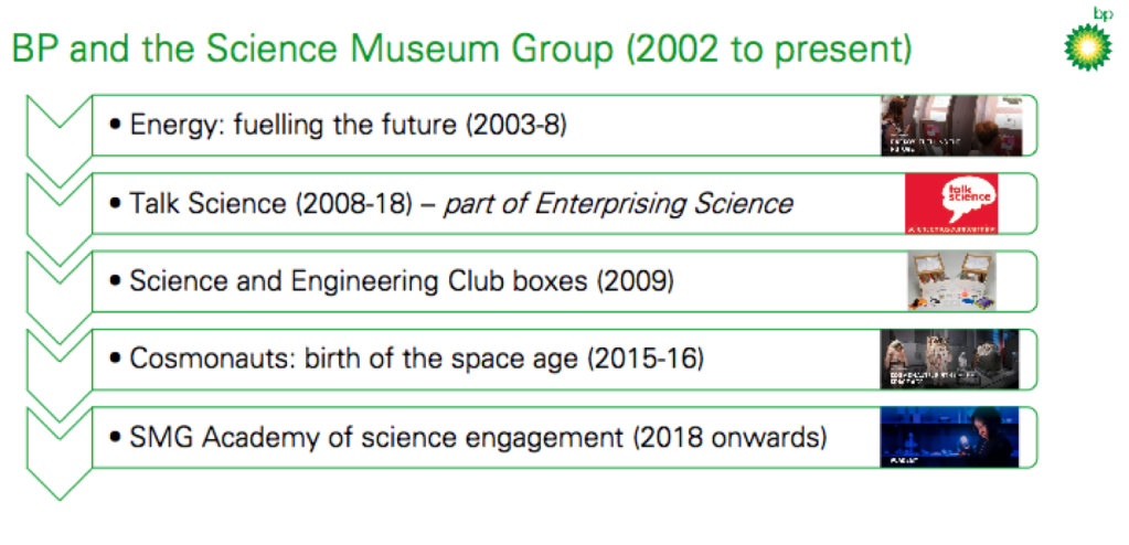 The opening slide though outlined the many different forms BP’s sponsorship of the Science Museum has taken since 2002, and primarily projects that target young people. The first project cited was BP’s sponsorship of the Science Museum’s ‘Energy: Fuelling the Future’ gallery, which still exists today. While it’s not clearly stated within the museum, that gallery was created in direct collaboration with a ‘BP Advisory Board’ formed of ten members of the oil giant’s staff. Today, it is the sponsor of a STEM Academy for training educators.